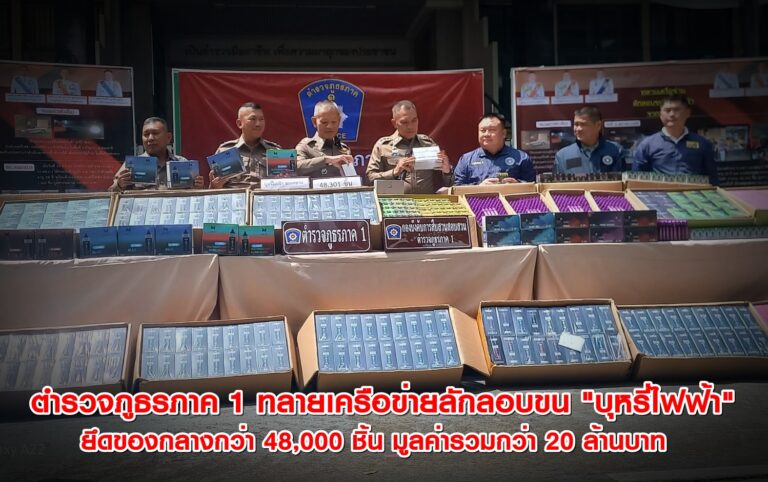 ตำรวจภูธรภาค 1 ทลายเครือข่ายลักลอบขน “บุหรี่ไฟฟ้า” ล็อตใหญ่จากภาคใต้เข้าพื้นที่ภาคกลาง ยึดของกลางกว่า 48,000 ชิ้น มูลค่ารวมกว่า 20 ล้านบาท ดำเนินคดีผู้เกี่ยวข้อง 3 ราย