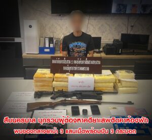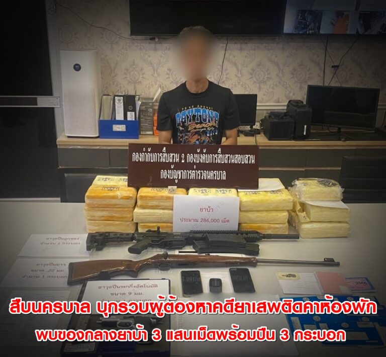 สืบนครบาล บุกรวบหนุ่มใหญ่วัย 46 ผู้ต้องหาคดียาเสพติดคาห้องพัก พบซุกของกลางยาบ้าเกือบ 3 แสนเม็ด พร้อมปืน 3 กระบอก