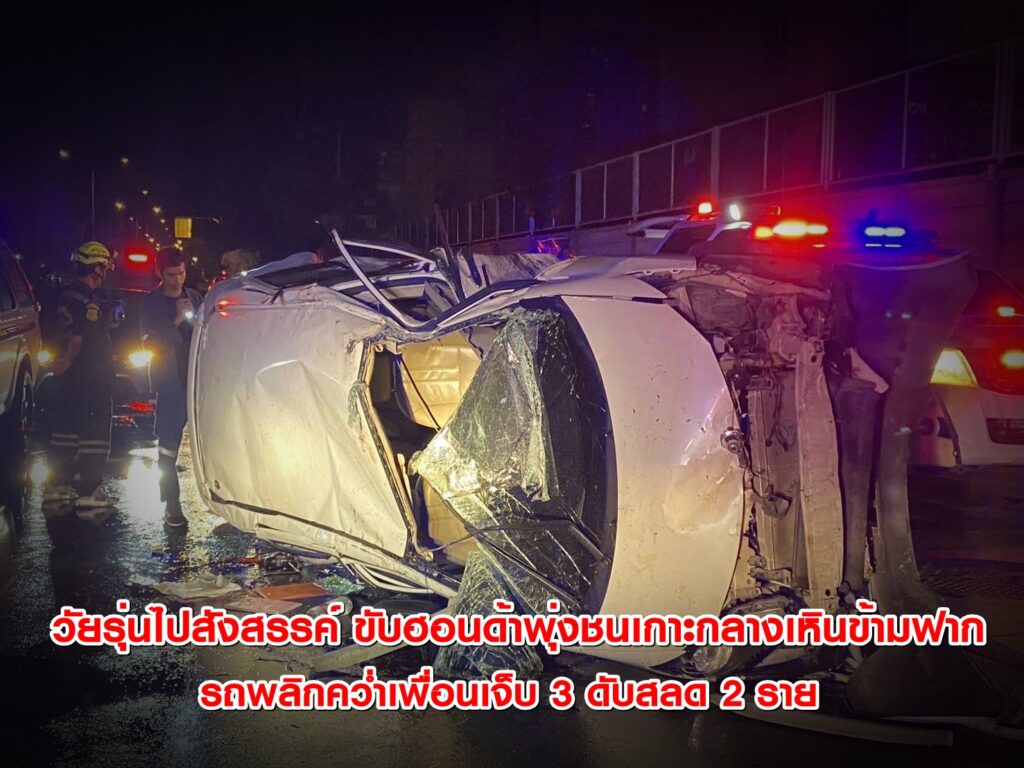 วัยรุ่นไปสังสรรค์ ขับฮอนด้าพุ่งชนเกาะกลางเหินข้ามฟากถนนฉลองกรุง รถพลิกคว่ำเพื่อนเจ็บ 3 ดับสลด 2 ราย