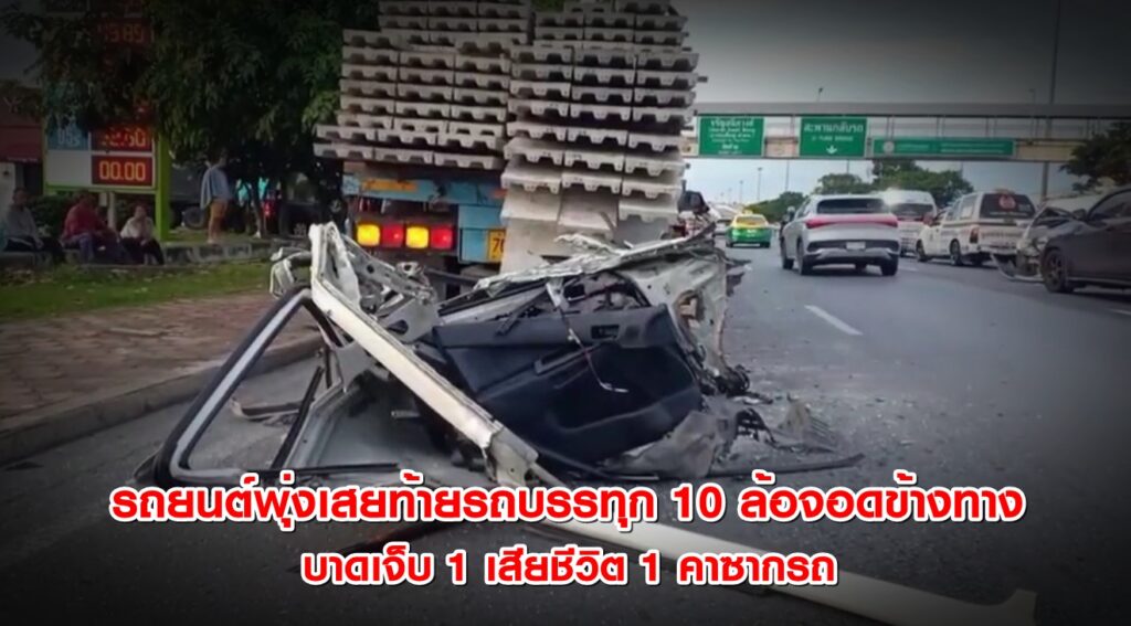 รถโตโยต้า วิช พุ่งเสยท้ายรถบรรทุก 10 ล้อจอดข้างทาง ชายคนขับบาดเจ็บ-หญิงนั่งมาด้วยเสียชีวิตคาซากรถ